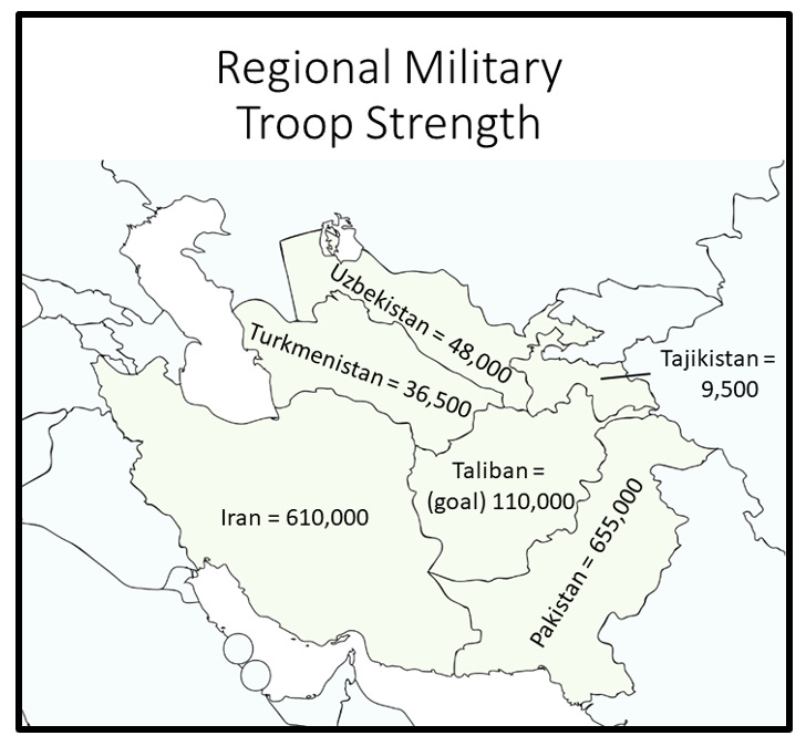 A Taliban force of 110,000 would vastly outnumber its “-stan” neighbors to the north, while their size would still pale in comparison to Iran and Pakistan.