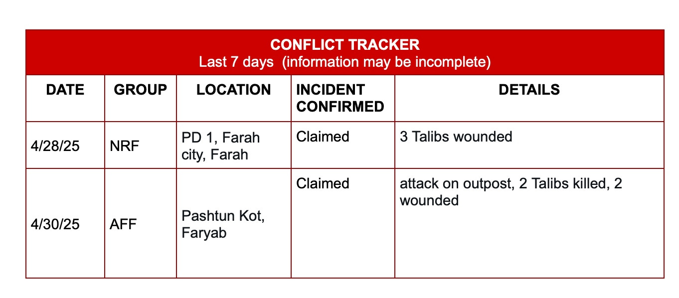 Taliban Claims Arrest of 3 AFF Fighters in Mazar – On Thursday, Taliban-linked media reported that Taliban security forces arrested a three-member cell allegedly behind an attack in Mazar-e-Sharif, Balkh province, earlier this year. The group is reportedly linked to the AFF, which claimed responsibility for previous attacks in February and March 2025. However, the AFF has denied any connection to the detained individuals.