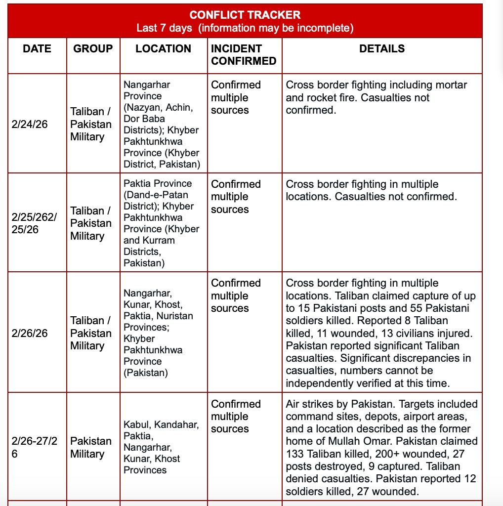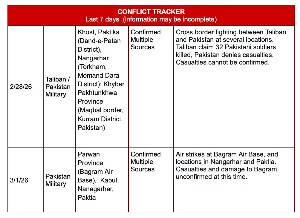 With the global focus on Iran, third country mediation between Afghanistan and Pakistan is not likely; Cross-border attacks and airstrikes are likely to continue in the coming week. Border areas, military positions, and government buildings in Kabul and Kandahar are the most likely targets. Afghans living near these areas are urged to exercise caution, as the risk of civilian casualties remains high. Afghans in Pakistan may face arrest, detention, and deportation during this period, regardless of visa status. Afghans in Pakistan should avoid crowded areas and protests.
