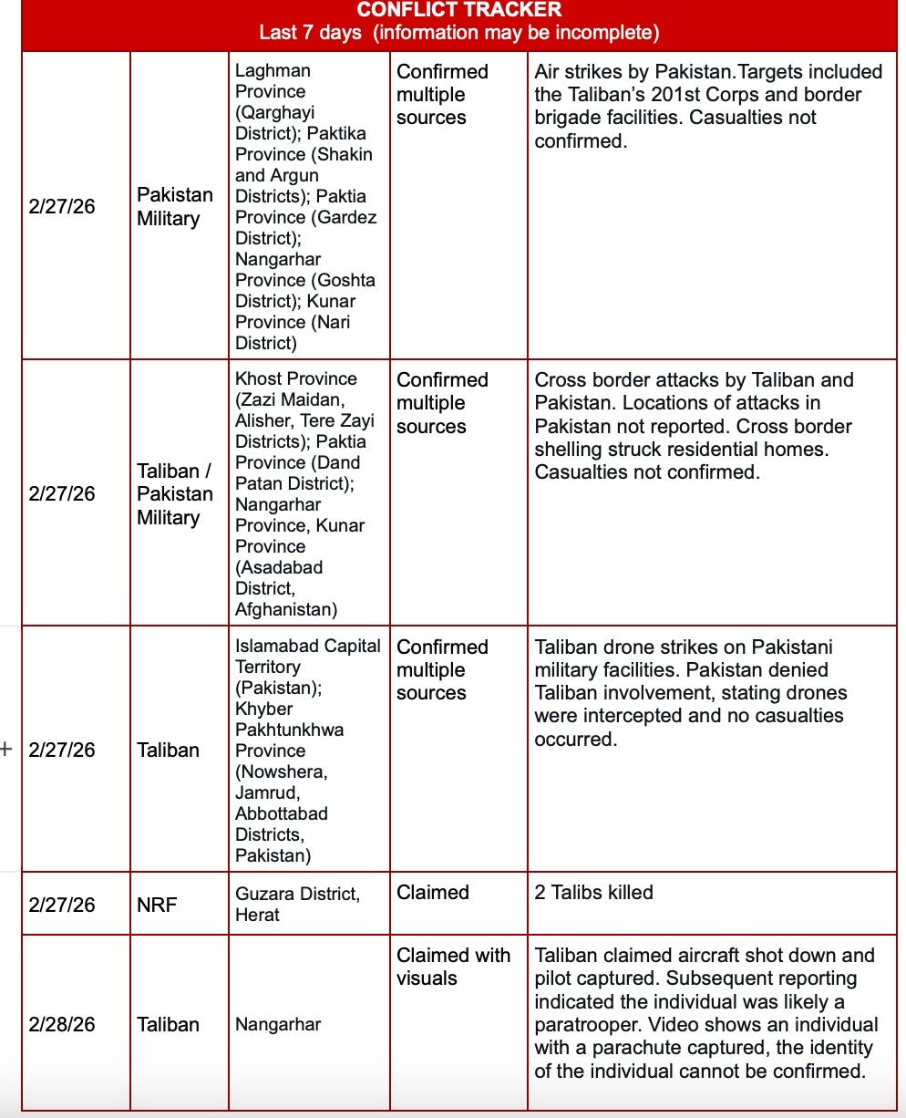 Cross Border Fighting Thursday – Fighting erupted late Thursday along multiple sections of the Afghanistan–Pakistan border, including in Nangarhar, Kunar, Khost, Paktia, and Nuristan provinces. The Taliban said they launched large-scale operations in response to recent Pakistani airstrikes, claiming to have captured up to 15 military posts and taken some personnel captive, though these claims cannot be independently verified.