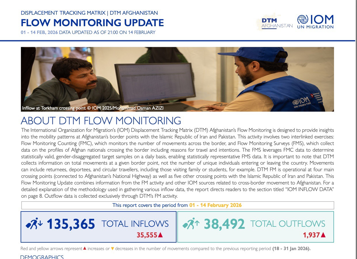 The International Organization for Migration’s (IOM) Displacement Tracking Matrix (DTM) Afghanistan’s Flow Monitoring is designed to provide insights into the mobility patterns at Afghanistan’s border points with the Islamic Republic of Iran and Pakistan. This activity involves two interlinked exercises: Flow Monitoring Counting (FMC), which monitors the number of movements across the border, and Flow Monitoring Surveys (FMS), which collect data on the profiles of Afghan nationals crossing the border including reasons for travel and intentions. The FMS leverages FMC data to determine statistically valid, gender-disaggregated target samples on a daily basis, enabling statistically representative FMS data. It is important to note that DTM collects information on total movements at a given border point, not the number of unique individuals entering or leaving the country. Movements can include returnees, deportees, and circular travellers, including those visiting family or students, for example. DTM FM is operational at four main crossing points (connected to Afghanistan’s National Highway) as well as five other crossing points with the Islamic Republic of Iran and Pakistan. This Flow Monitoring Update combines information from the FM activity and other IOM sources related to cross-border movement to Afghanistan. For a detailed explanation of the methodology used in gathering various inflow data, the report directs readers to the section titled “IOM INFLOW DATA” on page 8. Outflow data is collected exclusively through DTM’s FM activity.