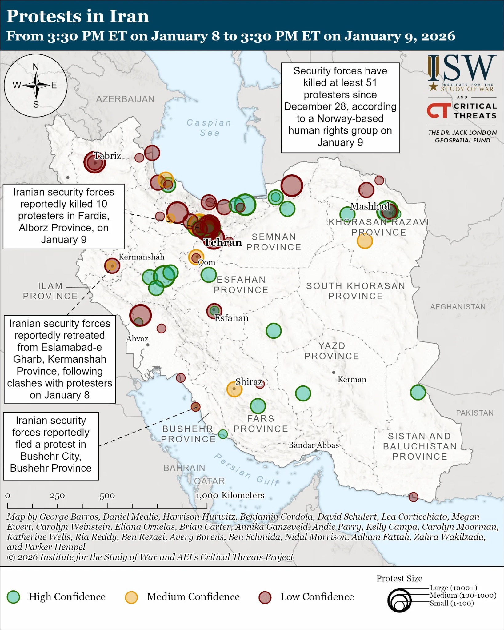 The Iranian regime has sustained its nationwide internet shutdown, likely to disrupt protest coordination and obscure the scale of its crackdown. Reports indicate that Iran’s internet connectivity has remained at approximately one percent of normal levels since 3:00 PM ET on January 8. The Iranian regime has historically imposed internet blackouts during periods of major unrest, including during the 2019 protests, when the regime killed around 1,500 protesters in less than two weeks. The internet shutdown reflects the regime’s concerns about the momentum of the protests and international scrutiny on its repression. The regime likely shut down the internet to disrupt protesters’ ability to communicate with one another and organize protests. The regime has also expanded its use of lethal force to crack down on protests beyond western and central Iran, and the internet shutdown is likely meant to hide the extent and brutality of the regime’s crackdown across Iran. A Norway-based Iranian human rights organization reported on January 9 that Iranian security forces have killed at least 51 protesters, including nine minors, and wounded hundreds of others since December 28. Anti-regime media reported on January 9 that Iranian security forces killed at least 10 protesters during demonstrations in Fardis, Alborz Province.