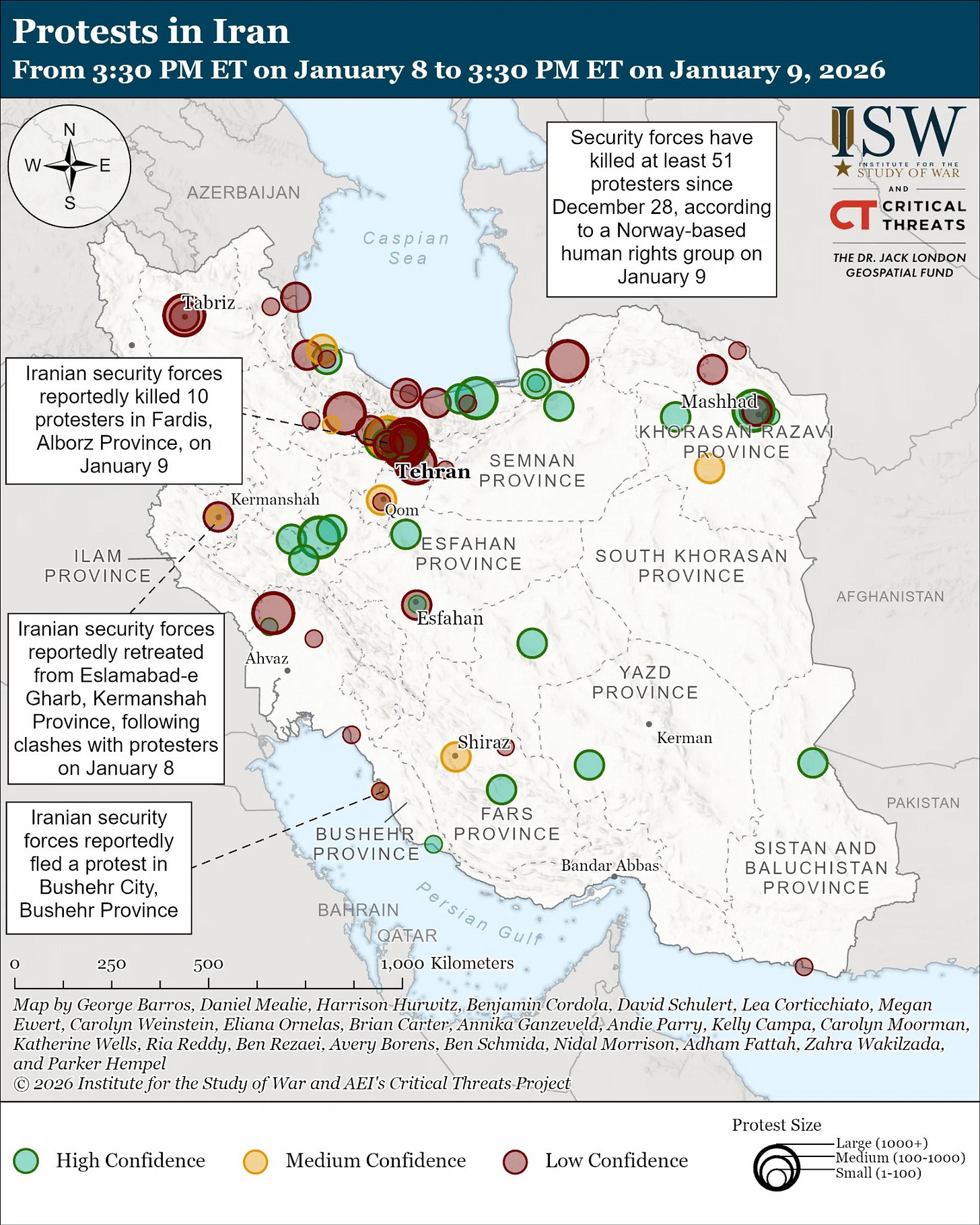 Widespread protest activity has continued to take place across Iran amid the internet shutdown.CTP-ISW has recorded 116 protests across 22 provinces since 3:30 PM ET on January 8. Twenty of these protests were large protests, which CTP-ISW defines as protests with more than 1,000 participants. CTP-ISW’s protest data since its last data cutoff likely reflects only part of the protest activity that has taken place in Iran since that time given that the internet shutdown restricts protesters’ ability to publish and share videos of the protests. Some protesters have reportedly used Starlink, which is a satellite-based internet service, to send reports of protests to foreign media.
