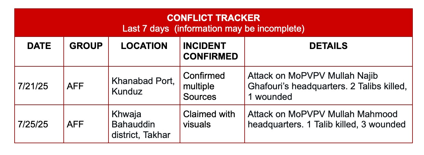 Media and Social Media Crackdown – In the past month, Taliban intelligence and the Office for the Promotion of Virtue have arrested dozens, including seven journalists, for alleged anti-Sharia social media content. Arrests—mostly at night—occurred in Kabul, Ghazni, Herat, Laghman, Kandahar, Sar-e-Pul, and other provinces. Families report no contact with detainees. Meanwhile, the Taliban have intensified crackdowns on TikTok creators and media outlets, even as they seek international legitimacy and cooperation amid growing engagement and pressures related to refugee repatriation.