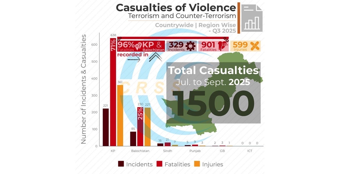 With at least 901 fatalities and 599 injuries – among civilians, security personnel, and outlaws – resulting from 329 incidents of violence, including terror attacks and counter-terror operations, Pakistan witnessed an over 46% surge in overall violence in its security landscape for the third quarter of 2025, according to the Center for Research and Security Studies (CRSS).