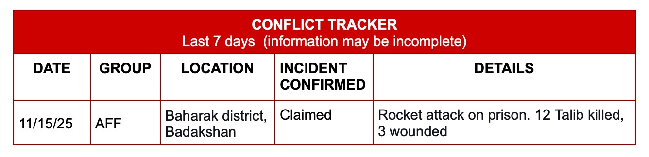 Former Advisor to Ghani Arrested – Last week, Akhtar Mohammad Badizai, a former adviser to President Ghani and head of Badizai Exchange in Kabul’s Sarai Shahzada market, was arrested by Taliban intelligence. Badizai had returned from Iran in 2024 through the Taliban’s outreach commission for former officials. His brother, Mahmood Khan Badizai, was allegedly abducted in Helmand in September 2025, though those claims remain unconfirmed.