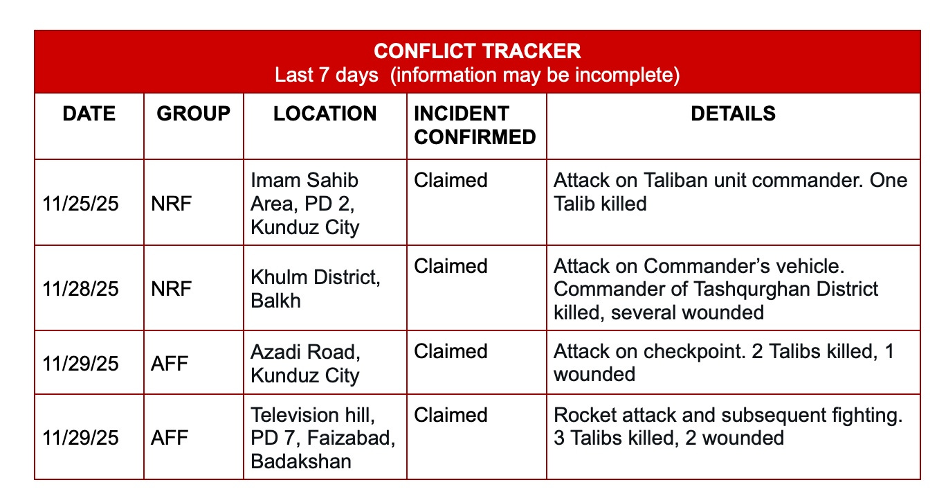 Poet Arrested in Balkh – On Sunday, November 23, Taliban intelligence arrested Balkh poet and cultural activist Sayed Sikandar Hosseini Bamdad as he was heading to work. Friends say the arrest was linked to his Persian-language poetry events, which had reportedly included female attendees. A week later, his whereabouts remain unknown despite conflicting statements from Taliban authorities.