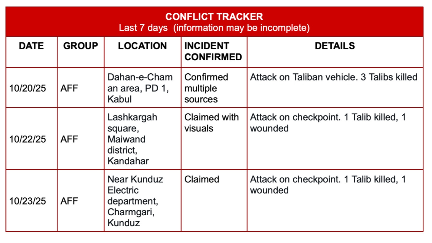 Türkiye Holds Second Round of Taliban/Pakistan Talks – Pakistan’s Foreign Ministry announced that Türkiye will host a second round of talks between Pakistan and the Taliban in Istanbul on October 25. Spokesperson Tahir Hussain Andrabi said the discussions aim to establish a “concrete and verifiable monitoring mechanism” to curb cross-border militancy. Delegations from both sides previously held ceasefire talks in Istanbul, mediated by Türkiye. Pakistan’s delegation included senior military, ISI, and Foreign Ministry officials. The Taliban delegation was led by Deputy Interior Minister Haji Najib and included Anas Haqqani and Suhail Shaheen. Both sides agreed to continue negotiations in the coming days, though talks appeared to stall on Sunday.
