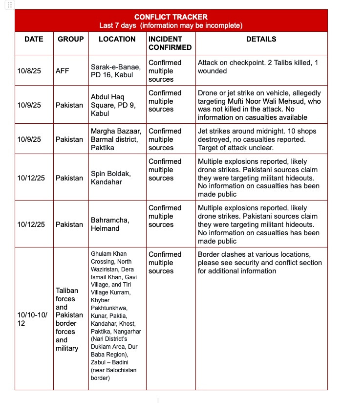 The security situation is extremely tense and is likely to remain so throughout the week. Pakistani strikes have heightened regional tensions, with border skirmishes and closures expected. Afghans are urged to exercise extreme caution near the Afghanistan–Pakistan border. All border crossings between Pakistan and Afghanistan are currently closed. Additionally, statements by U.S. President Trump regarding Bagram have increased internal tensions. Intensified security crackdowns—especially in northern provinces—should be anticipated, including house-to-house searches, phone inspections, and additional checkpoints. These operations appear to target former Afghan government officials, particularly those associated with the NDS, ANSF, or individuals with ties to, or potential recruitment into, resistance forces. This includes recent returnees or deportees from both Pakistan and Iran.