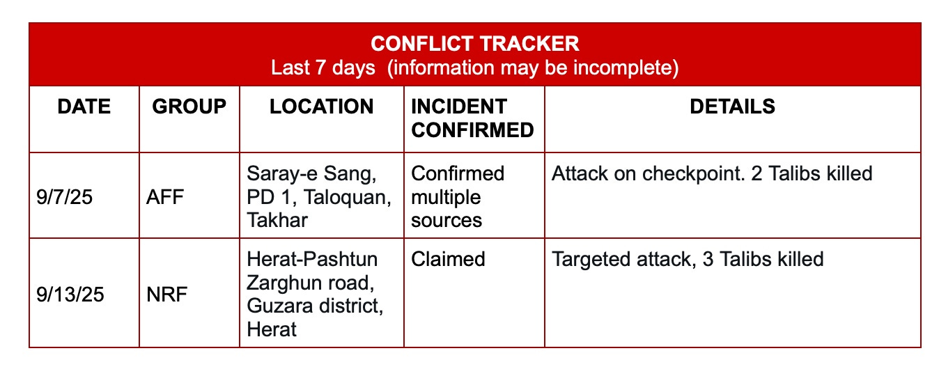 Taliban Beat Woman at Checkpoint – On September 7, Taliban forces severely beat a woman at a checkpoint on the Badakhshan–Takhar road. The incident occurred after fighters ordered women in a car to remove their veils. When one protested, she was assaulted and later hospitalized with visible injuries.